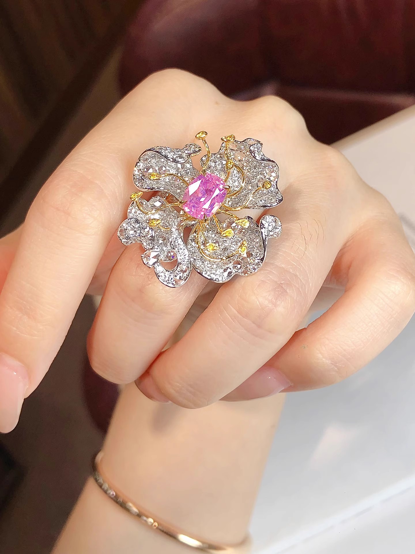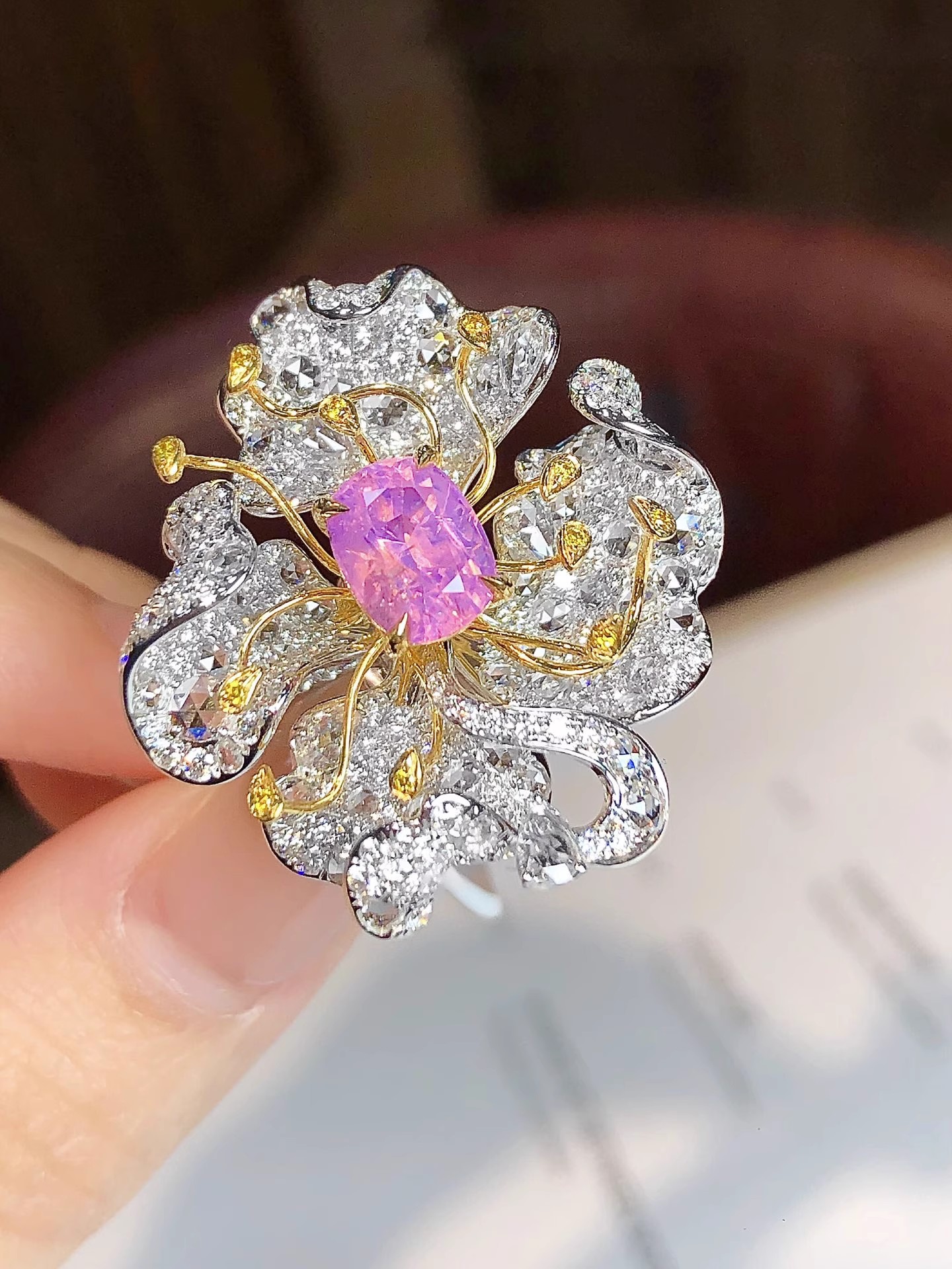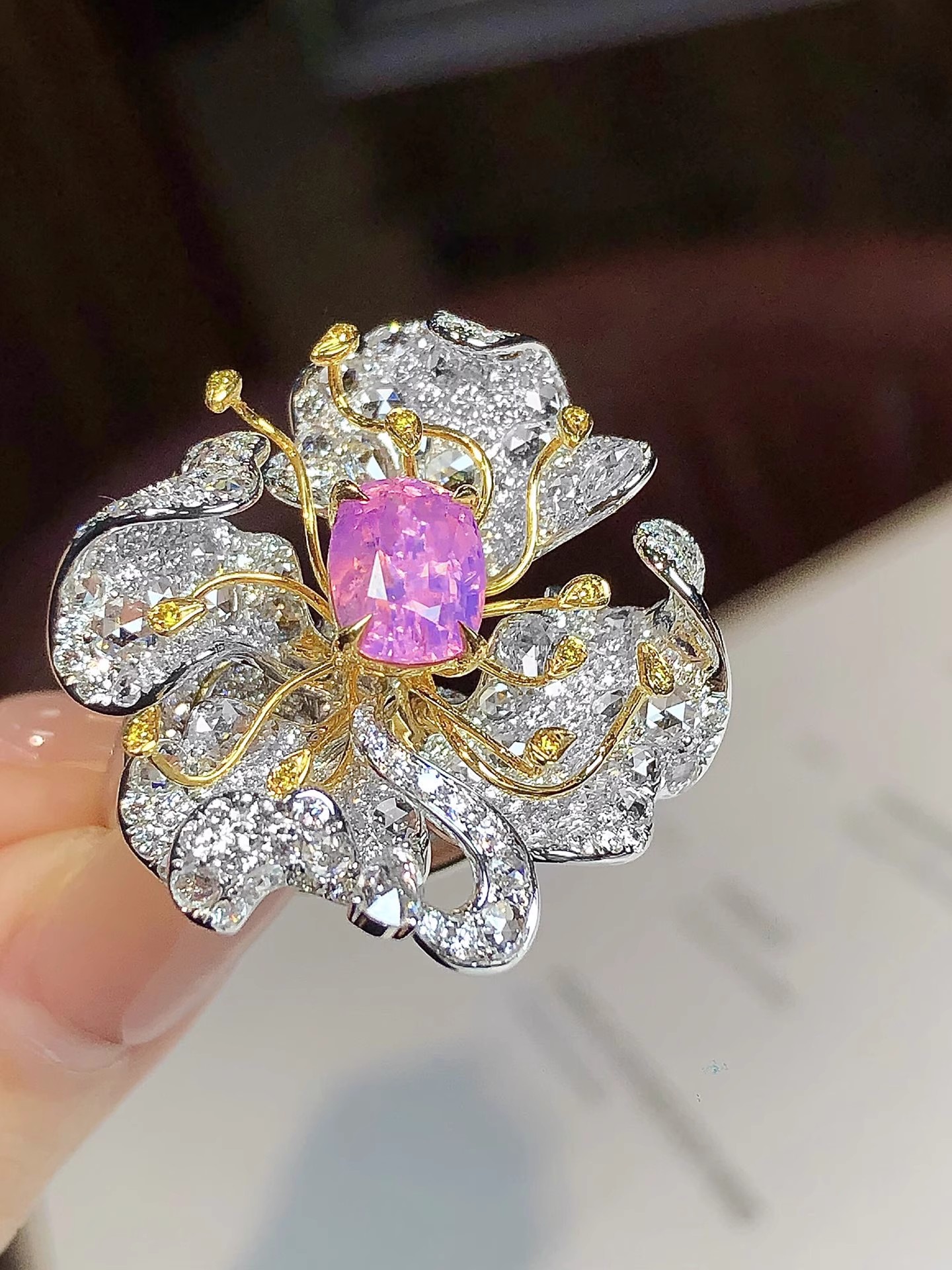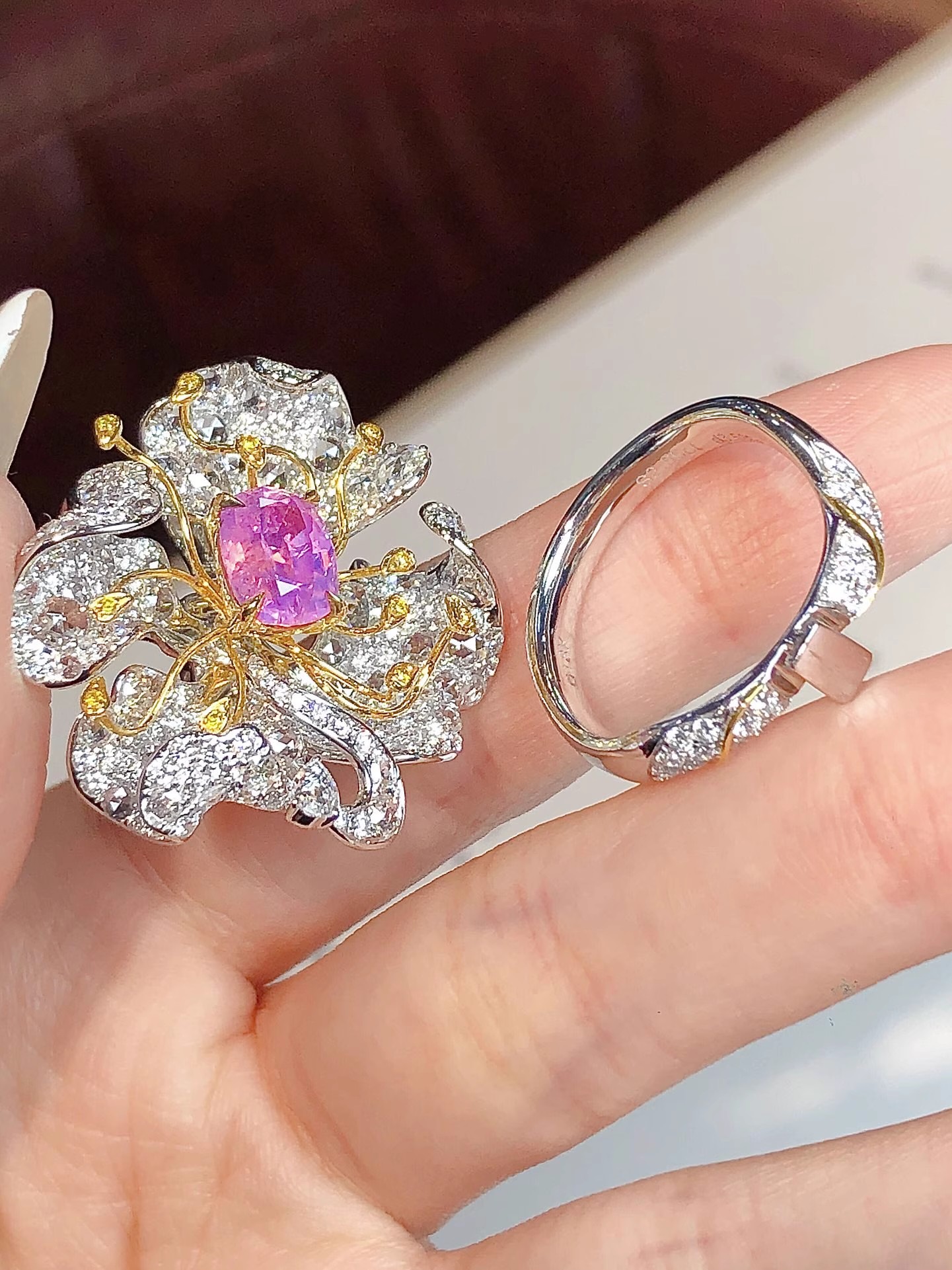 The precious and rare gemstone from a rare source and the artistic design are worthy of repeated appreciation.