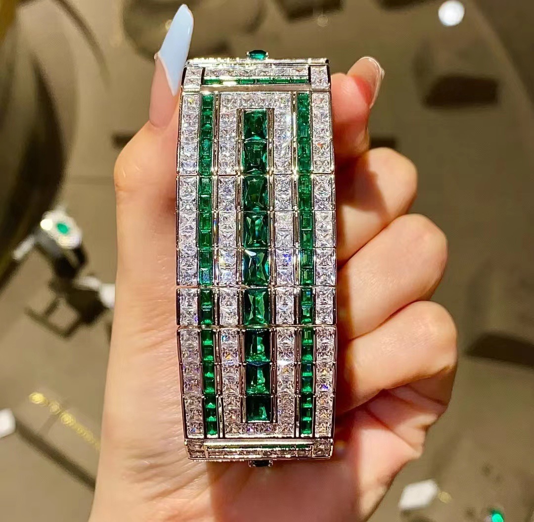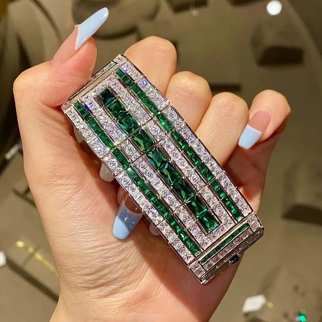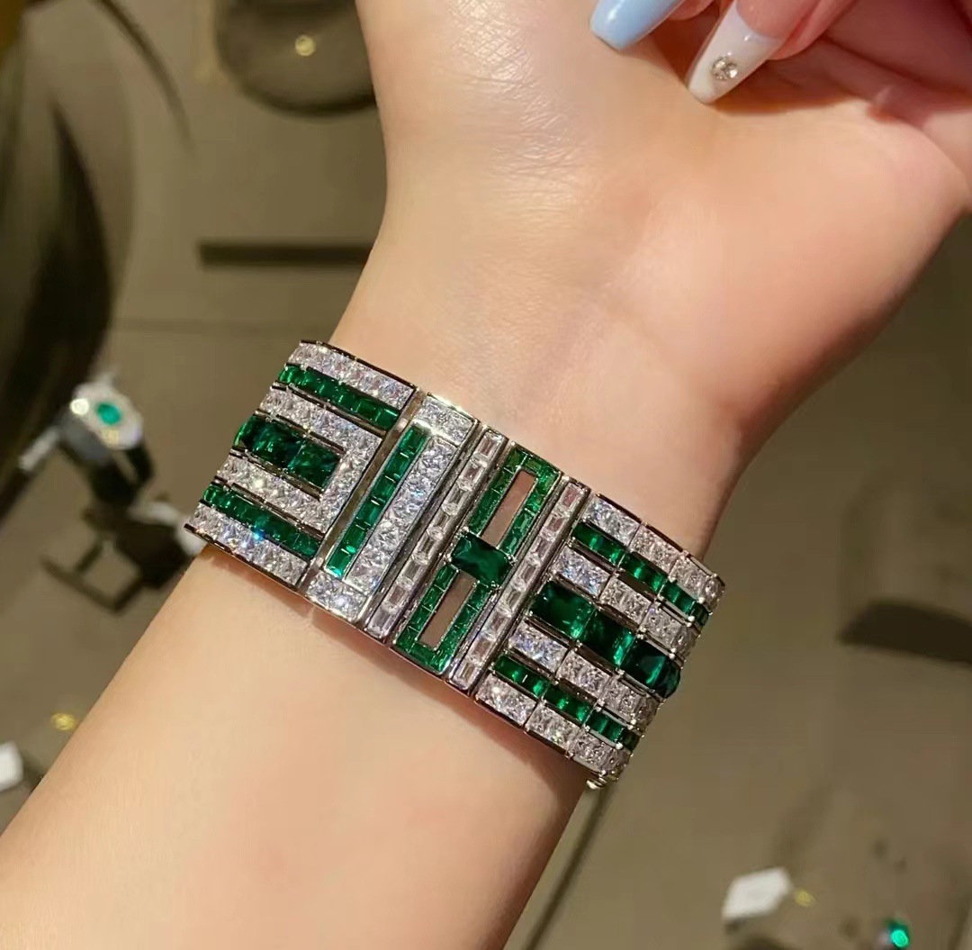 547#Luxurious wide bracelet – S925 silver cultured emerald bracelet, fashionable with diamonds, high-end style bracelet, ideal gift for parties or festivals