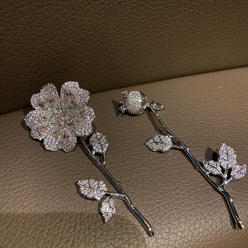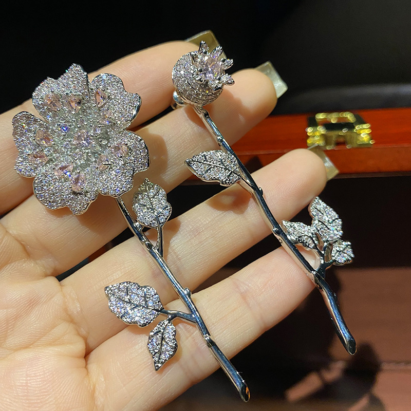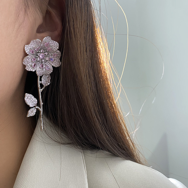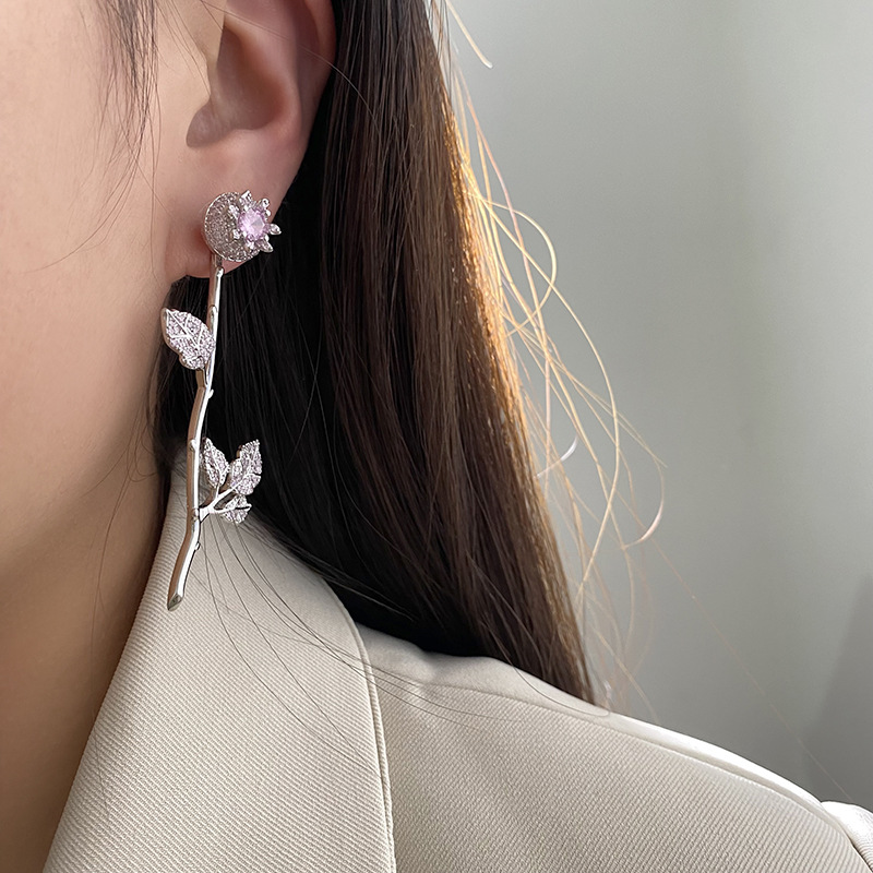 #8358 S925 Silver Needle European and American Heavy Industry Fashion Flower Earrings Asymmetric bouquet of roses Three dimensional niche earrings set with pink diamonds Personalized earrings